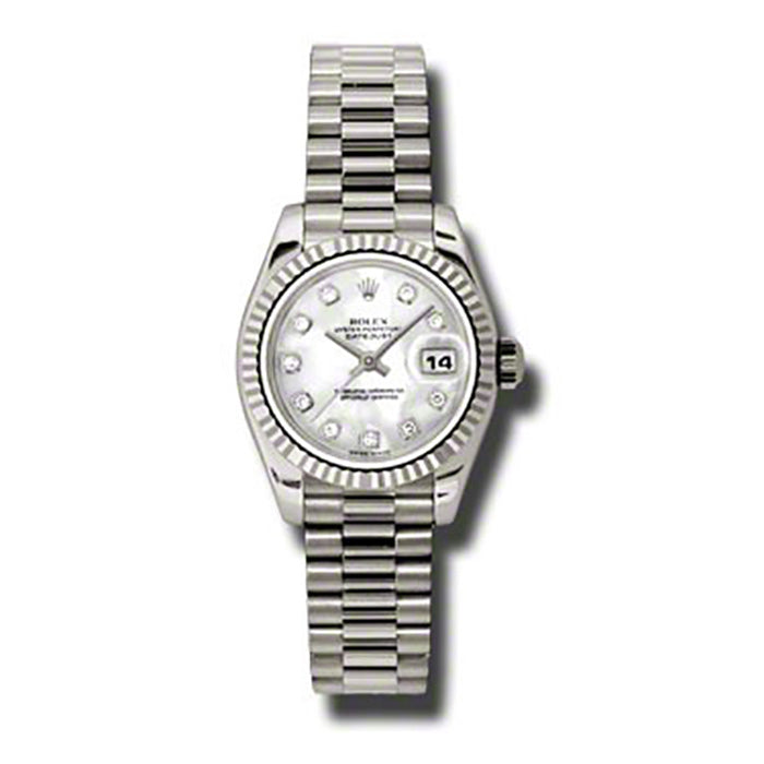 Rolex 179179MDP Oyster Perpetual Lady-Datejust Watch. 26mm 18kt white gold case, fluted bezel, mother of pearl dial, diamond hour markers, and President bracelet.