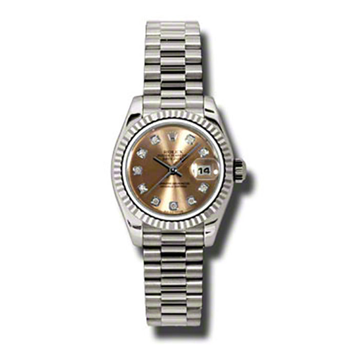 Rolex Lady-Datejust 26 Pink Dial 18K White Gold President Automatic Ladies Diamond Watch 179179PDP. 18kt white gold case with a 18kt white gold Rolex President bracelet. Fixed - fluted 18k white gold bezel. Pink dial with silver-tone hands and diamond hour markers. Automatic movement. Scratch resistant sapphire crystal. Screw down crown. Solid case back. Case diameter: 26 mm. Round case shape. Concealed Crown clasp. Water resistant at 100 meters / 330 feet. Functions: date, hour, minute, second.