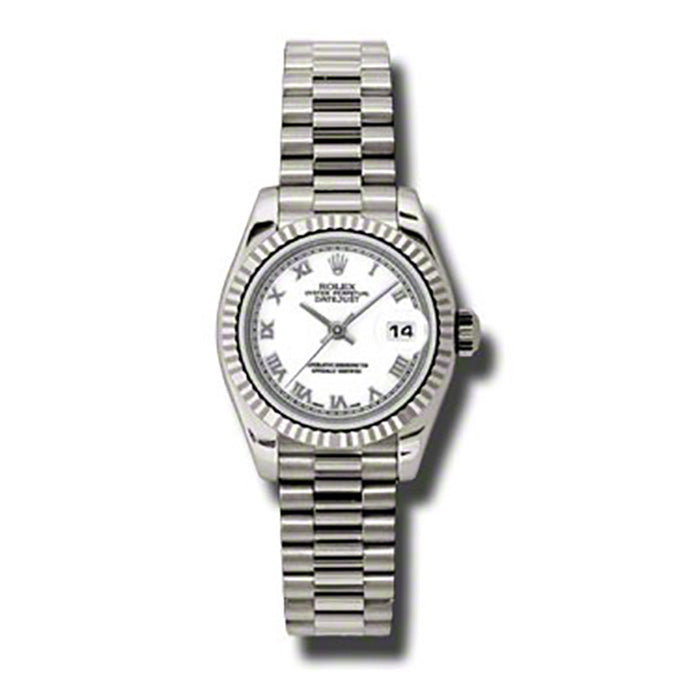 Rolex Lady-Datejust 26 White Dial 18K White Gold President Automatic Ladies Watch 179179WRP. 18kt white gold case with a 18kt white gold Rolex President bracelet. Fixed - fluted 18kt white gold bezel. White dial with silver-tone hands and Roman numeral hour markers. Minute markers around the outer rim. Automatic movement. Scratch resistant sapphire crystal. Screw down crown. Solid case back. Case diameter: 26 mm. Round case shape. Concealed Crown clasp. Water resistant at 100 meters / 330 feet. Functions: date, hour, minute, second.