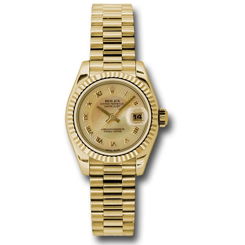 The Rolex 179178 CHMDRP Oyster Perpetual Lady-Datejust is a stunning blend of sophistication and luxury. It features a 26mm case crafted from 18K yellow gold, highlighted by a classic fluted bezel that enhances its timeless aesthetic. The champagne decorated mother-of-pearl dial adds a unique touch, showcasing Roman numerals that lend a sense of elegance and readability. Complementing the watch is the iconic President bracelet, also made of 18K yellow gold, known for its comfort and durability. This exquisite timepiece not only embodies refined craftsmanship but also serves as a perfect accessory for any occasion, making it a highly coveted choice for watch enthusiasts.