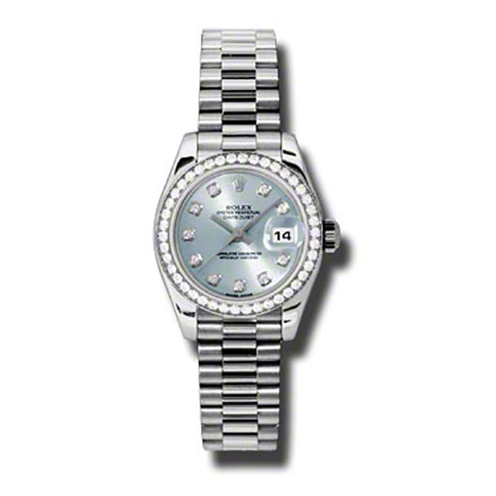 Rolex 179136 ibdp Oyster Perpetual Lady-Datejust Watch. 26mm platinum case, bezel set with 42 diamonds, ice blue dial, diamond hour markers, and President bracelet.