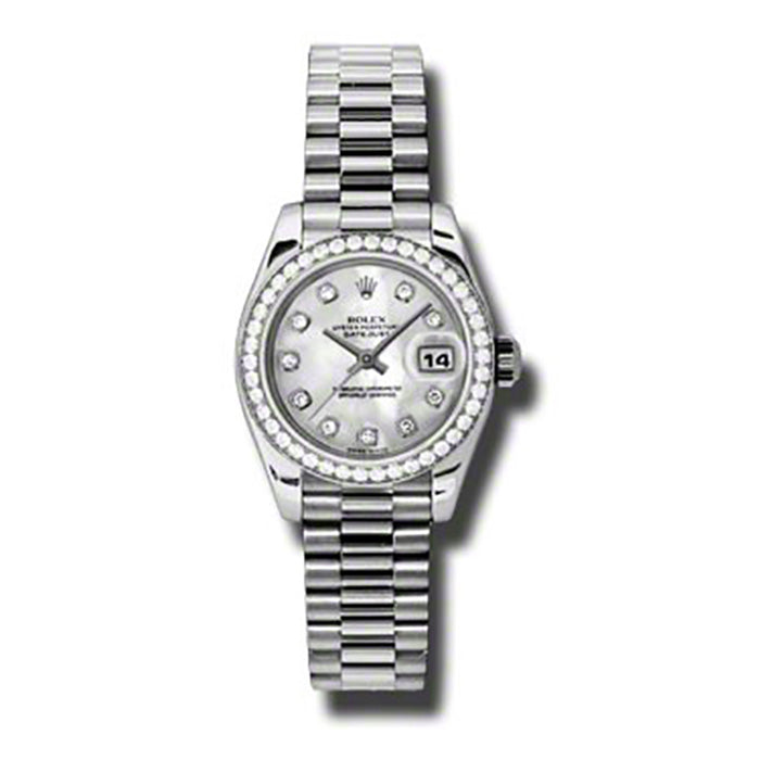 Rolex Lady-Datejust 26 Mother Of Pearl Dial Platinum President Automatic Ladies Watch 179136MDP. Platinum case with a platinum Rolex president bracelet. Fixed - platinum diamond-set bezel. Mother of pearl dial with silver tone hands and diamond hour markers. Diamonds. Automatic movement, Rolex calibre 2235 engine with about 48 hours power reserve. Scratch resistant sapphire crystal. Screw down crown. Solid case back. Case diameter: 26 mm. Round case shape. Concealed crown clasp. Water resistant at 100 meters / 330 feet. Functions: date, hour, minute, second.