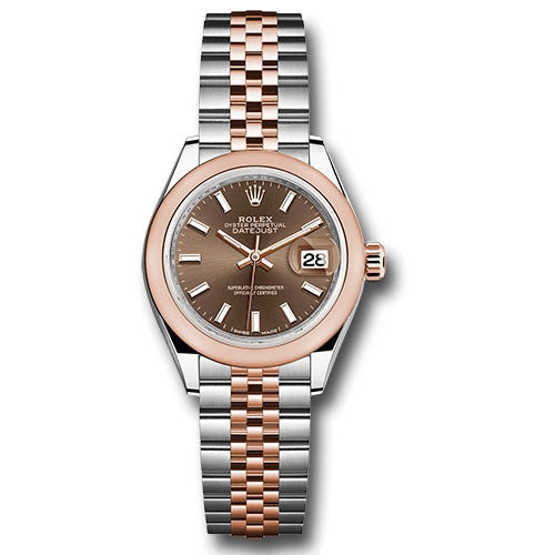 Rolex 279161 choij Lady-Datejust 28 Watch. 28mm Everose Rolesor case comprised of a 904L steel monobloc middle case, screw-down steel back, 18K Everose gold screw-down crown with twinlock double waterproofness system, 18K Everose gold domed bezel, scratch-resistant sapphire crystal with cyclops lens over the date and double anti-reflective coating, chocolate dial, index hour markers, Rolex calibre 2236 automatic movement with center hour, minute and seconds hands, instantaneous date with rapid setting, and stop-seconds for precise time setting, Everose Rolesor Jubilee bracelet comprised of a combination of 904L steel and 18K Everose gold in five-piece links, concealed folding Crownclasp buckle. Waterproof to 100 meters.