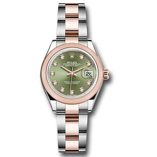 Rolex 279161 ogdo Lady-Datejust 28 Watch. 28mm Everose Rolesor case comprised of a 904L steel monobloc middle case, screw-down steel back, 18K Everose gold screw-down crown with twinlock double waterproofness system, 18K Everose gold domed bezel, scratch-resistant sapphire crystal with cyclops lens over the date and double anti-reflective coating, olive green dial, diamond hour markers, Rolex calibre 2236 automatic movement with center hour, minute and seconds hands, instantaneous date with rapid setting, and stop-seconds for precise time setting, Everose Rolesor Oyster bracelet comprised of a combination of 904L steel and 18K Everose gold in flat three-piece links, folding Oysterclasp buckle with Easylink 5mm comfort extension link. Waterproof to 100 meters.