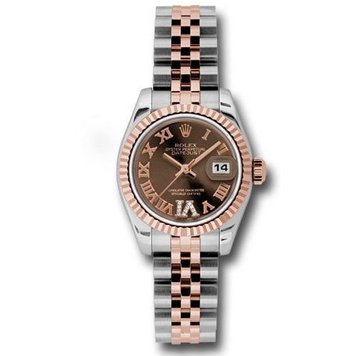 Rolex 179171CHODRJ Oyster Perpetual Lady Datejust Watch. 26mm stainless steel case, screw-down crown, 18kt Everose gold fluted bezel, scratch-resistant sapphire crystal with cyclops lens over the date, chocolate diamond Roman VI dial, Roman numerals with 11 diamonds set on VI , Rolex calibre 2235 automatic movement, stainless steel and Everose gold Jubilee bracelet with five-piece links, concealed folding Crownclasp buckle. Water resistant to 100 meters.