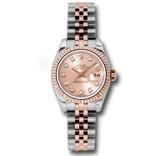 Rolex Datejust Automatic Stainless Steel w/ 18kt Rose Gold Ladies Watch 179171PDJ. Stainless steel case with a stainless steel and 18kt rose gold bracelet. Fluted 18kt rose gold bezel. Pink dial with rose-gold tone hands and diamond hour markers. Automatic movement. Scratch resistant sapphire crystal. Screw down crown. Solid case back. Case diameter: 26 mm. Round case shape. Concealed crown clasp. Water resistant at 100 meters / 330 feet. Functions: date, hour, minute, second.