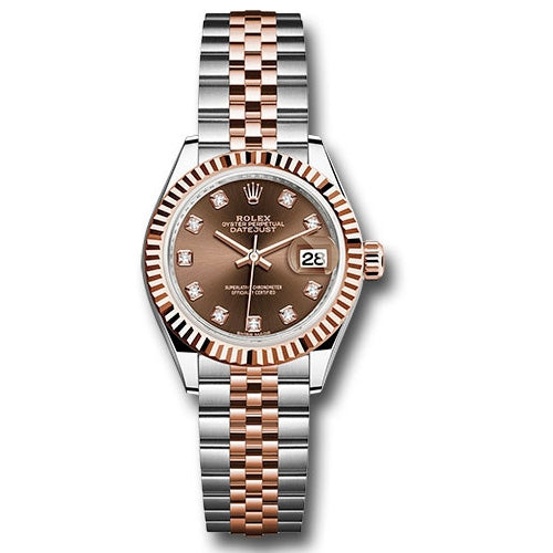 Rolex 279171CHODJ 28mm Lady Datejust. Everose Rolesor case comprised of a 904L steel monobloc middle case, screw-down steel back, 18K Everose gold screw-down crown with twinlock double waterproofness system, 18K Everose gold fluted bezel, scratch-resistant sapphire crystal with cyclops lens over the date and double anti-reflective coating, chocolate dial, diamond hour markers, Rolex calibre 2236 automatic movement with center hour, minute and seconds hands, instantaneous date with rapid setting, and stop-seconds for precise time setting, Everose Rolesor Jubilee bracelet comprised of a combination of 904L steel and 18K Everose gold in five-piece links, concealed folding Crownclasp buckle. Waterproof to 100 meters.
