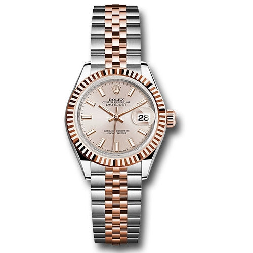 Rolex 279171SUIJ 28mm Lady Datejust. Everose Rolesor case comprised of a 904L steel monobloc middle case, screw-down steel back, 18K Everose gold screw-down crown with twinlock double waterproofness system, 18K Everose gold fluted bezel, scratch-resistant sapphire crystal with cyclops lens over the date and double anti-reflective coating, sundust dial, index hour markers, Rolex calibre 2236 automatic movement with center hour, minute and seconds hands, instantaneous date with rapid setting, and stop-seconds for precise time setting, Everose Rolesor Jubilee bracelet comprised of a combination of 904L steel and 18K Everose gold in five-piece links, concealed folding Crownclasp buckle. Waterproof to 100 meters.