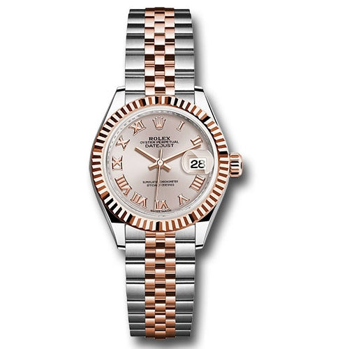 Rolex 279171 SURJ Datejust Lady 28 Steel and Everose Gold - Fluted Bezel - Jubilee. 28mm Everose Rolesor case comprised of a 904L steel monobloc middle case, screw-down steel back, 18K Everose gold screw-down crown with twinlock double waterproofness system, 18K Everose gold fluted bezel, scratch-resistant sapphire crystal with cyclops lens over the date and double anti-reflective coating, sundust dial, Roman numerals, Rolex calibre 2236 automatic movement with center hour, minute and seconds hands, instantaneous date with rapid setting, and stop-seconds for precise time setting, Everose Rolesor Jubilee bracelet comprised of a combination of 904L steel and 18K Everose gold in five-piece links, concealed folding Crownclasp buckle. Waterproof to 100 meters.