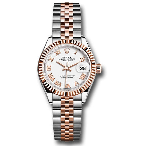 Rolex 279171WRJ Datejust Lady 28 Steel and Everose Gold - Fluted Bezel - Jubilee. 28mm Everose Rolesor case comprised of a 904L steel monobloc middle case, screw-down steel back, 18K Everose gold screw-down crown with twinlock double waterproofness system, 18K Everose gold fluted bezel, scratch-resistant sapphire crystal with cyclops lens over the date and double anti-reflective coating, white dial, Roman numerals, Rolex calibre 2236 automatic movement with center hour, minute and seconds hands, instantaneous date with rapid setting, and stop-seconds for precise time setting, Everose Rolesor Jubilee bracelet comprised of a combination of 904L steel and 18K Everose gold in five-piece links, concealed folding Crownclasp buckle. Waterproof to 100 meters.
