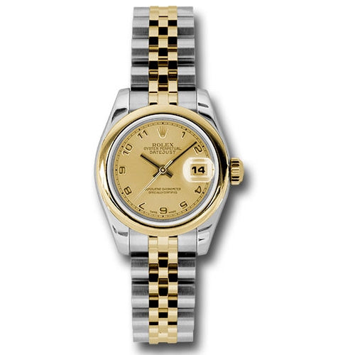 Rolex 179163 chaj Oyster Perpetual Lady Datejust Watch. 26mm stainless steel case, 18K yellow gold domed bezel, champagne dial, Arabic numerals, and stainless steel and 18K yellow gold Jubilee bracelet.