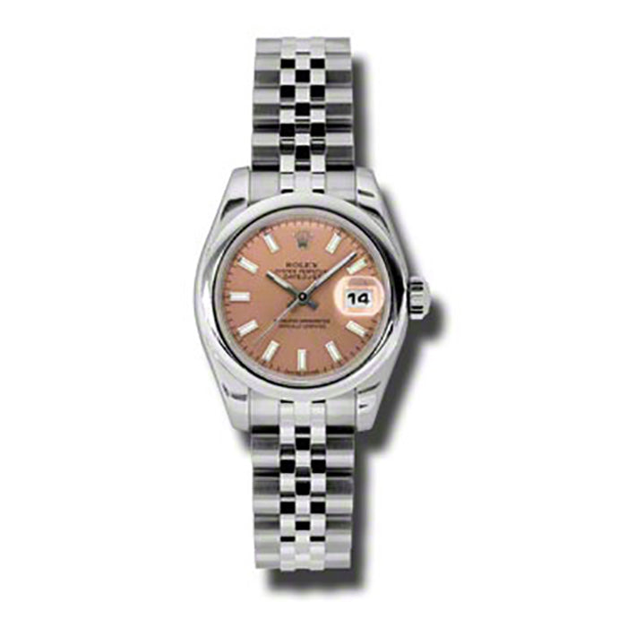 Rolex Lady Datejust Pink Roman Dial Jubilee Automatic Watch 179160PSJ. Stainless steel case with a stainless steel Rolex Jubilee bracelet. Fixed domed bezel. Pink dial with silver-tone hands and index hour markers. Rolex Calibre 2235 automatic movement with a 48-hour power reserve. Scratch resistant sapphire crystal. Screw down crown. Solid case back. Case size: 26 mm. Round case shape. Concealed crown clasp. Water resistant at 100 meters / 330 feet. Functions: hours, minutes, seconds, date.