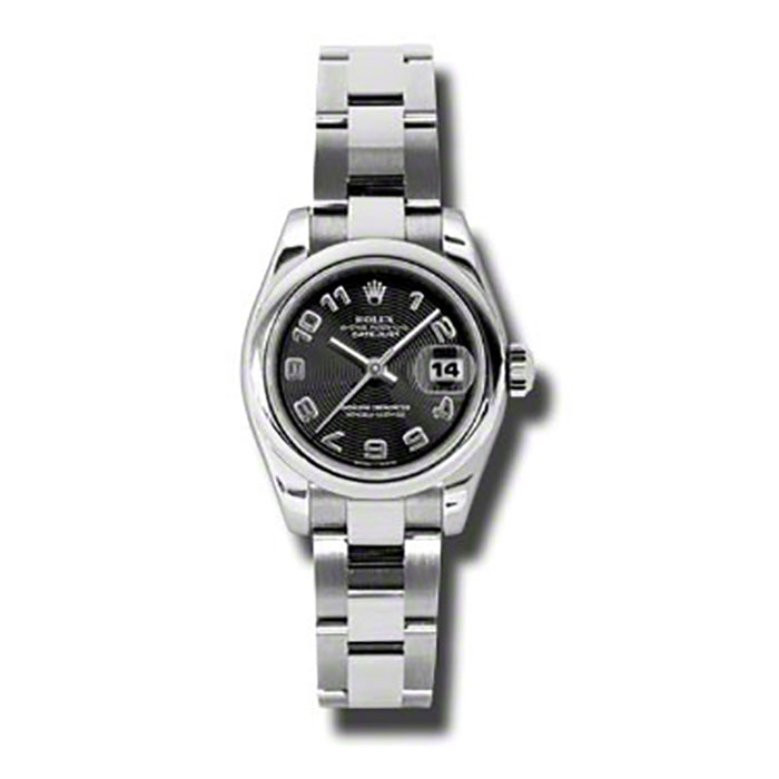 Rolex Datejust 26 Black Stainless Steel Automatic 179160BKCAO. Silver-tone stainless steel case with a silver-tone stainless steel rolex oyster bracelet. Fixed domed bezel. Black concentric dial with silver-tone hands and Arabic hour markers. Rolex Calibre 2235 automatic movement with a 48-hour power reserve. Scratch resistant sapphire crystal. Case size: 26 mm. Concealed crown clasp. Water resistant at 100 meters / 330 feet. Functions: date, hour, minute, second, chronometer.