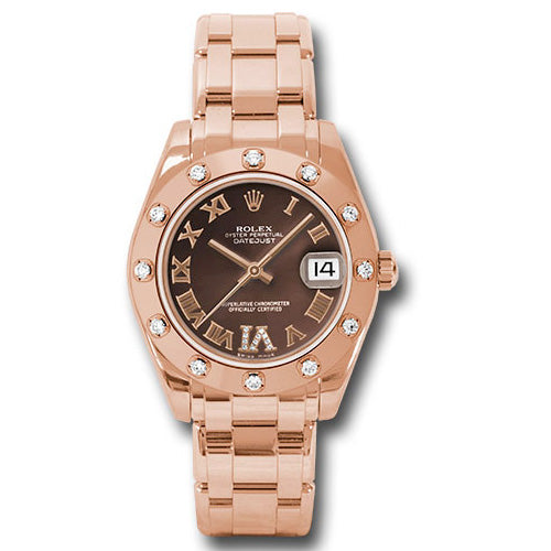 Rolex 81315CHODR Oyster Perpetual Datejust Pearlmaster Watch. 34mm 18kt Everose gold case, screw-down crown, polished bezel set with 12 diamonds, scratch-resistant sapphire crystal with cyclops lens over the date, chocolate dial, Roman numerals with 11 diamonds set on VI , Rolex calibre 2235 automatic movement, 18kt Everose gold Pearlmaster bracelet with rounded five-piece links, concealed folding Crownclasp buckle. Water resistant to 100 meters.