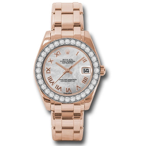 Rolex 81285 mrp Oyster Perpetual Datejust Pearlmaster Ladies Watch. 34mm 18K Everose gold case, bezel set with 32 diamonds, mother of pearl dial, Roman numerals, Pearlmaster bracelet with rounded five-piece links, concealed folding Crownclasp. Water resistant to 100 meters.