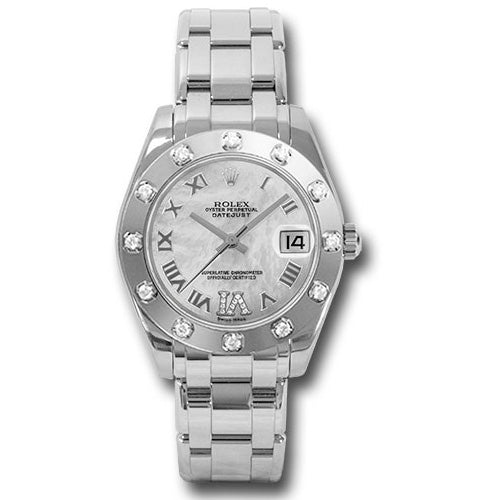 Rolex 81319 mdr Oyster Perpetual Datejust Pearlmaster Ladies Watch. 34mm 18K white gold case, screw-down crown, polished bezel set with 12 diamonds, scratch-resistant sapphire crystal with cyclops lens over the date, white mother-of-pearl dial, Roman numerals with 11 diamonds set on VI , Rolex calibre 2235 automatic movement, 18K white gold Pearlmaster bracelet with rounded five-piece links, concealed folding Crownclasp buckle. Water resistant to 100 meters.