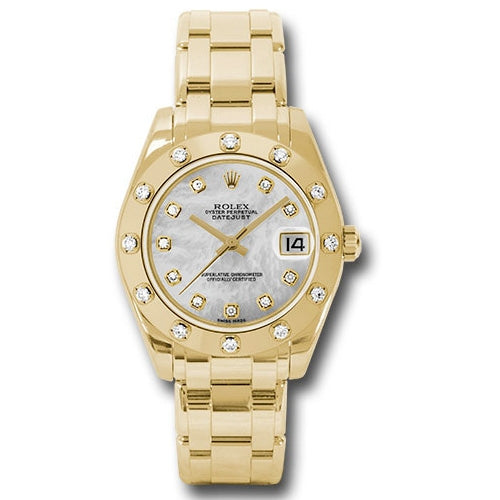 Rolex 81318 md Oyster Perpetual Datejust Pearlmaster Ladies Watch. 34mm 18K yellow gold case, screw-down crown, polished bezel set with 12 diamonds, scratch-resistant sapphire crystal with cyclops lens over the date, white mother-of-pearl dial, 10 diamond hour markers, Rolex calibre 2235 automatic movement, 18K yellow gold Pearlmaster bracelet with rounded five-piece links, concealed folding Crownclasp buckle. Water resistant to 100 meters.