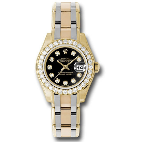 Rolex 80298bic bkd Masterpiece Oyster Perpetual Lady-Datejust Pearlmaster Watch. 29mm 18K yellow gold case, bezel set with 32 diamonds, black dial, diamond hour markers, Tridor Pearlmaster bracelet (18K yellow, white, and pink gold).