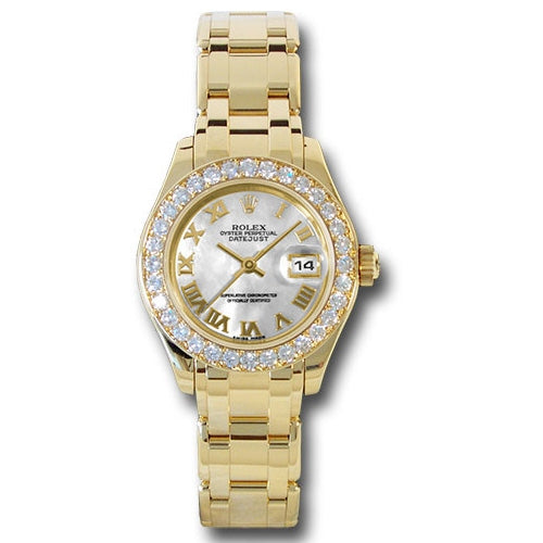 Rolex 80298 mr Masterpiece Oyster Perpetual Lady-Datejust Pearlmaster Watch. 29mm 18K yellow gold case, bezel set with 32 diamonds, mother of pearl dial, Roman numerals, Pearlmaster bracelet.