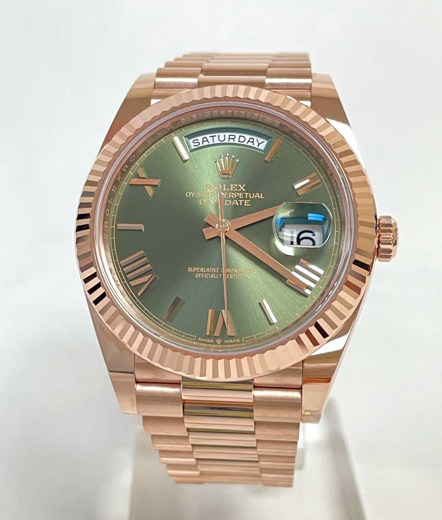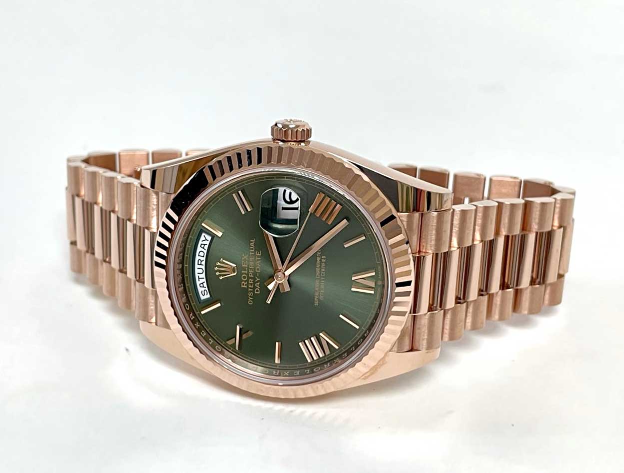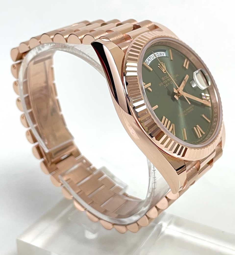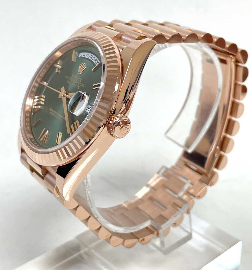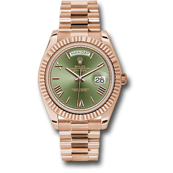 Rolex 228235OGRP Oyster Perpetual Day-Date Men's Watch. 40mm 18kt Everose gold case, screw-down back with Rolex fluting, screw-down crown with twinlock double waterproofness system, fluted bezel, scratch-resistant double anti-reflective sapphire crystal with cyclops lens over the date, olive green dial, bevelled deconstructed Roman numerals, Rolex calibre 3255 automatic movement with centre hour, minute and seconds hands, instantaneous day and date in apertures, unrestricted rapid-setting, and stop-seconds for precise time setting, approximately 70 hours of power reserve, President bracelet with three-piece solid links comprised of a polished center link, satin-finished outer links, and ceramic inserts, concealed folding Crownclasp buckle. Waterproof to 100 meters.