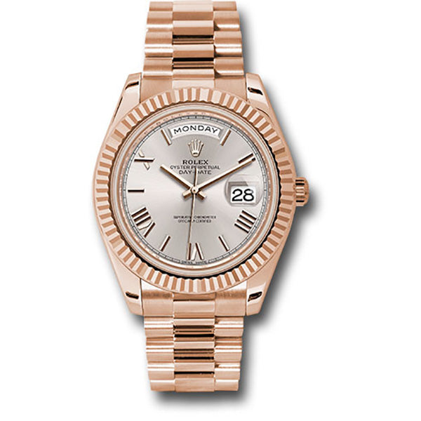 Rolex 228235 sdrp Oyster Perpetual Day-Date 40 Mens Watch. 40mm 18K Everose gold case, screw-down back with Rolex fluting, screw-down crown with twinlock double waterproofness system, fluted bezel, scratch-resistant double anti-reflective sapphire crystal with cyclops lens over the date, Sundust dial, bevelled deconstructed Roman numerals, Rolex calibre 3255 automatic movement with centre hour, minute and seconds hands, instantaneous day and date in apertures, unrestricted rapid-setting, and stop-seconds for precise time setting, approximately 70 hours of power reserve, President bracelet with three-piece solid links comprised of a polished center link, satin-finished outer links, and ceramic inserts, concealed folding Crownclasp buckle. Waterproof to 100 meters.
