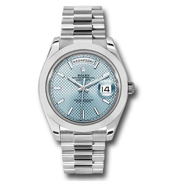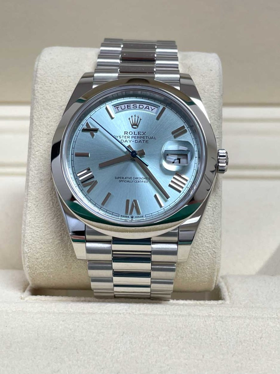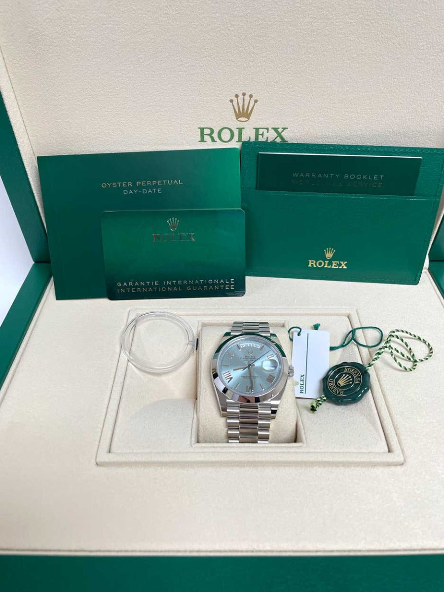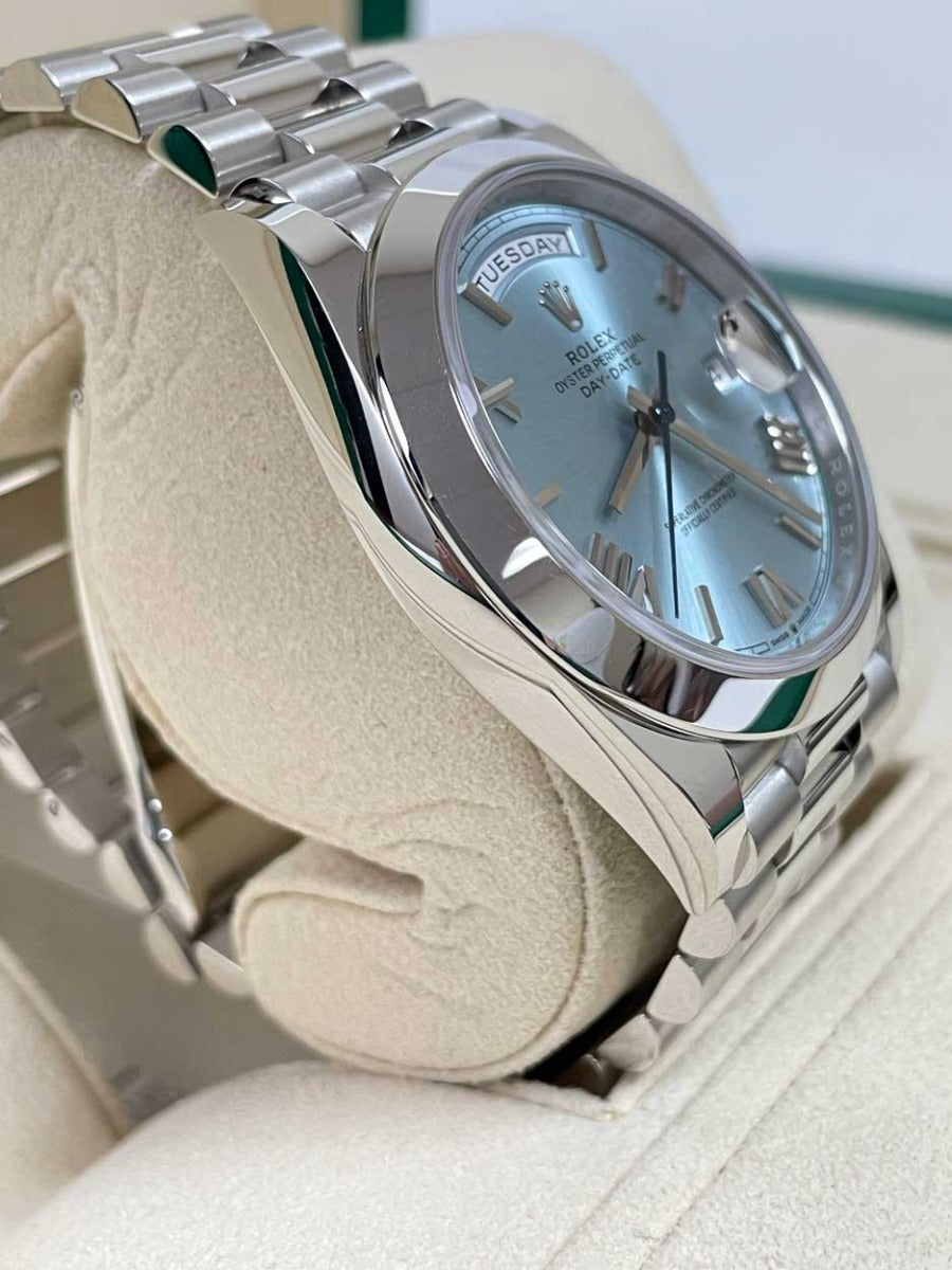 Rolex 228206 ibdmip Oyster Perpetual Day-Date Men's Watch. 40mm 950 platinum case, screw-down back with Rolex fluting, screw-down crown with twinlock double waterproofness system, smooth bezel, scratch-resistant double anti-reflective sapphire crystal with cyclops lens over the date, ice blue Roman dial, Rolex calibre 3255 automatic movement with centre hour, minute and seconds hands, instantaneous day and date in apertures, unrestricted rapid-setting, and stop-seconds for precise time setting, approximately 70 hours of power reserve, President bracelet with three-piece solid links comprised of a polished center link, satin-finished outer links, and ceramic inserts, concealed folding Crownclasp buckle. Waterproof to 100 meters.