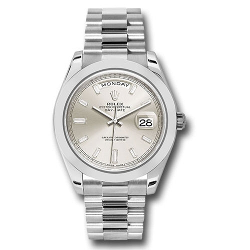 Rolex 228206 sbdp Oyster Perpetual Day-Date Men's Watch. 40mm 950 platinum case, screw-down back with Rolex fluting, screw-down crown with twinlock double waterproofness system, smooth bezel, scratch-resistant double anti-reflective sapphire crystal with cyclops lens over the date, silver dial, 10 baguette diamond hour markers, Rolex calibre 3255 automatic movement with centre hour, minute and seconds hands, instantaneous day and date in apertures, unrestricted rapid-setting, and stop-seconds for precise time setting, approximately 70 hours of power reserve, President bracelet with three-piece solid links comprised of a polished center link, satin-finished outer links, and ceramic inserts, concealed folding Crownclasp buckle. Waterproof to 100 meters.
