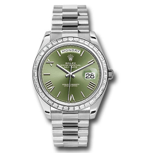 Rolex 228396TBR ogrp Oyster Perpetual Day-Date Men's Watch. 40mm 950 platinum case, screw-down back with Rolex fluting, screw-down crown with twinlock double waterproofness system, bezel set with 40 baguette-cut diamonds, scratch-resistant double anti-reflective sapphire crystal with cyclops lens over the date, olive green dial, bevelled deconstructed Roman numerals, Rolex calibre 3255 automatic movement with centre hour, minute and seconds hands, instantaneous day and date in apertures, unrestricted rapid-setting, and stop-seconds for precise time setting, approximately 70 hours of power reserve, President bracelet with three-piece solid links comprised of a polished center link, satin-finished outer links, and ceramic inserts, concealed folding Crownclasp buckle. Waterproof to 100 meters.