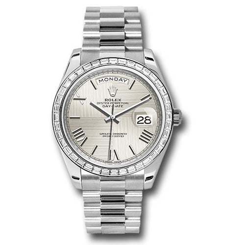 Rolex 228396TBR sqmrp Oyster Perpetual Day-Date Men's Watch. 40mm 950 platinum case, screw-down back with Rolex fluting, screw-down crown with twinlock double waterproofness system, bezel set with 40 baguette-cut diamonds, scratch-resistant double anti-reflective sapphire crystal with cyclops lens over the date, silver quadrant motif dial, bevelled deconstructed Roman numerals, Rolex calibre 3255 automatic movement with centre hour, minute and seconds hands, instantaneous day and date in apertures, unrestricted rapid-setting, and stop-seconds for precise time setting, approximately 70 hours of power reserve, President bracelet with three-piece solid links comprised of a polished center link, satin-finished outer links, and ceramic inserts, concealed folding Crownclasp buckle. Waterproof to 100 meters.