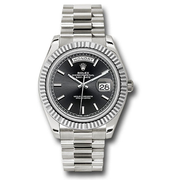 Rolex 228239 BKIP Oyster Perpetual Day-Date Men's Watch. 40mm 18kt white gold case, screw-down back with Rolex fluting, screw-down crown with twinlock double waterproofness system, fluted bezel, scratch-resistant double anti-reflective sapphire crystal with cyclops lens over the date, black dial, index hour markers with Chromalight, Rolex calibre 3255 automatic movement with centre hour, minute and seconds hands, instantaneous day and date in apertures, unrestricted rapid-setting, and stop-seconds for precise time setting, approximately 70 hours of power reserve, President bracelet with three-piece solid links comprised of a polished center link, satin-finished outer links, and ceramic inserts, concealed folding Crownclasp buckle. Waterproof to 100 meters.