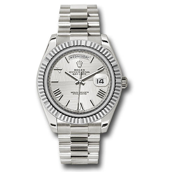 Rolex 228239 sqmrp Oyster Perpetual Day-Date 40 Mens Watch. 40mm 18K white gold case, screw-down back with Rolex fluting, screw-down crown with twinlock double waterproofness system, fluted bezel, scratch-resistant double anti-reflective sapphire crystal with cyclops lens over the date, silver quadrant motif dial, bevelled deconstructed Roman numerals, Rolex calibre 3255 automatic movement with centre hour, minute and seconds hands, instantaneous day and date in apertures, unrestricted rapid-setting, and stop-seconds for precise time setting, approximately 70 hours of power reserve, President bracelet with three-piece solid links comprised of a polished center link, satin-finished outer links, and ceramic inserts, concealed folding Crownclasp buckle. Waterproof to 100 meters.