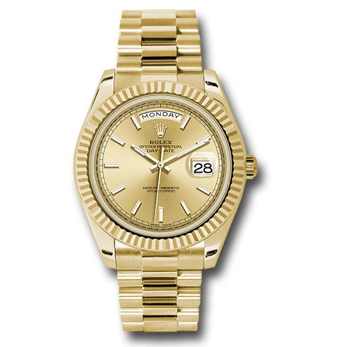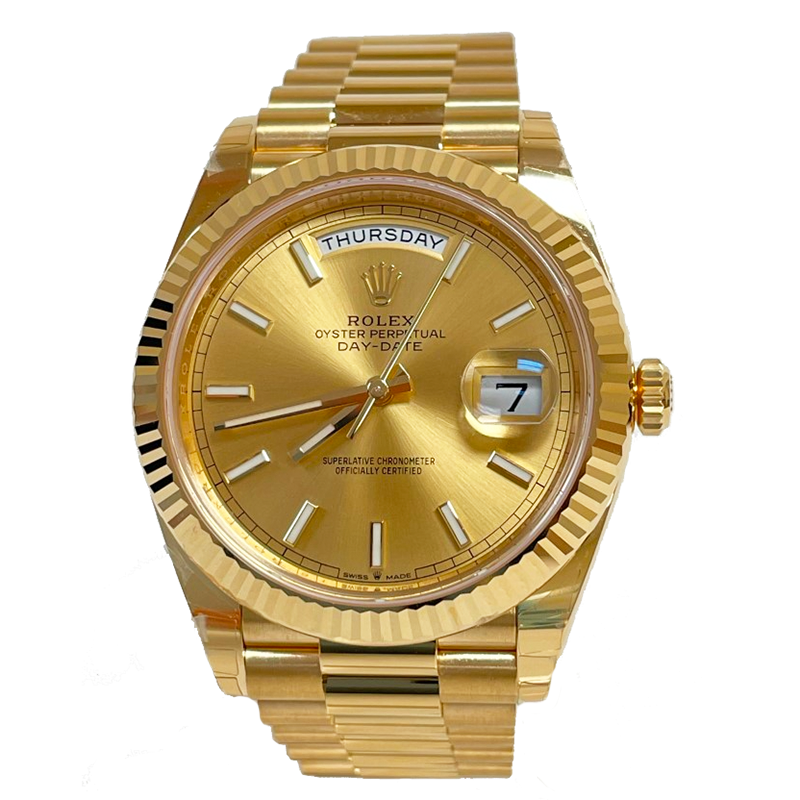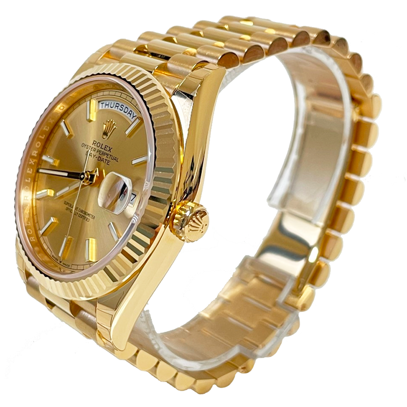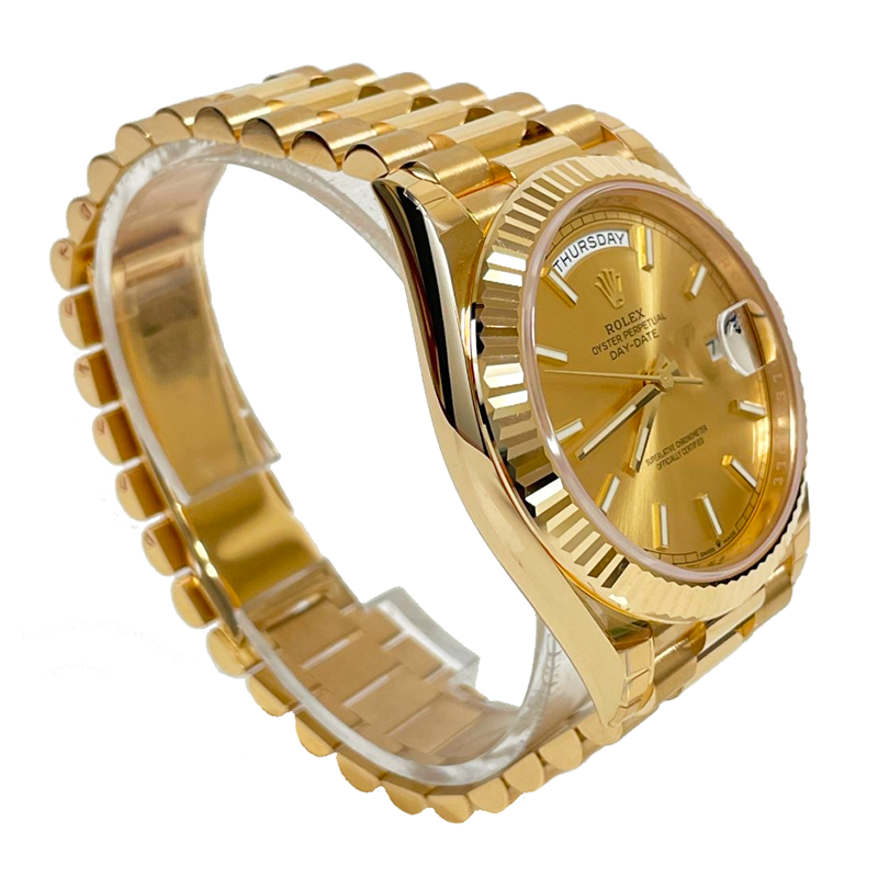 Rolex 228238 chip Oyster Perpetual Day-Date 40 Men's Watch. 40mm 18K yellow gold case, screw-down back with Rolex fluting, screw-down crown with twinlock double waterproofness system, fluted bezel, scratch-resistant double anti-reflective sapphire crystal with cyclops lens over the date, champagne dial, index hour markers with Chromalight, Rolex calibre 3255 automatic movement with centre hour, minute and seconds hands, instantaneous day and date in apertures, unrestricted rapid-setting, and stop-seconds for precise time setting, approximately 70 hours of power reserve, President bracelet with three-piece solid links comprised of a polished center link, satin-finished outer links, and ceramic inserts, concealed folding Crownclasp buckle. Waterproof to 100 meters.