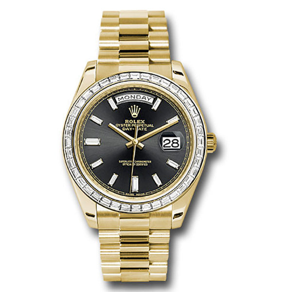 Rolex 228398TBR bkbdp Oyster Perpetual Day-Date Men's Watch. 40mm 18K yellow gold case, screw-down back with Rolex fluting, screw-down crown with twinlock double waterproofness system, bezel set with 48 diamonds, scratch-resistant double anti-reflective sapphire crystal with cyclops lens over the date, black dial, 10 baguette diamond hour markers, Rolex calibre 3255 automatic movement with centre hour, minute and seconds hands, instantaneous day and date in apertures, unrestricted rapid-setting, and stop-seconds for precise time setting, approximately 70 hours of power reserve, President bracelet with three-piece solid links comprised of a polished center link, satin-finished outer links, and ceramic inserts, concealed folding Crownclasp buckle. Waterproof to 100 meters.