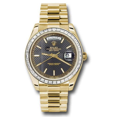 Rolex 228398TBR bkdmip Oyster Perpetual Day-Date Men's Watch. 40mm 18K yellow gold case, screw-down back with Rolex fluting, screw-down crown with twinlock double waterproofness system, bezel set with 50 baguette-cut diamonds, scratch-resistant double anti-reflective sapphire crystal with cyclops lens over the date, black diagonal motif dial, index hour markers with Chromalight, Rolex calibre 3255 automatic movement with centre hour, minute and seconds hands, instantaneous day and date in apertures, unrestricted rapid-setting, and stop-seconds for precise time setting, approximately 70 hours of power reserve, President bracelet with three-piece solid links comprised of a polished center link, satin-finished outer links, and ceramic inserts, concealed folding Crownclasp buckle. Waterproof to 100 meters.