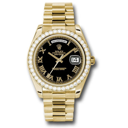 Rolex 218348 bkrp Oyster Perpetual Day-Date II Watch. The Rolex President. 41mm 18kt yellow gold case, bezel set with 42 diamonds, black dial, Roman numerals, and President bracelet.