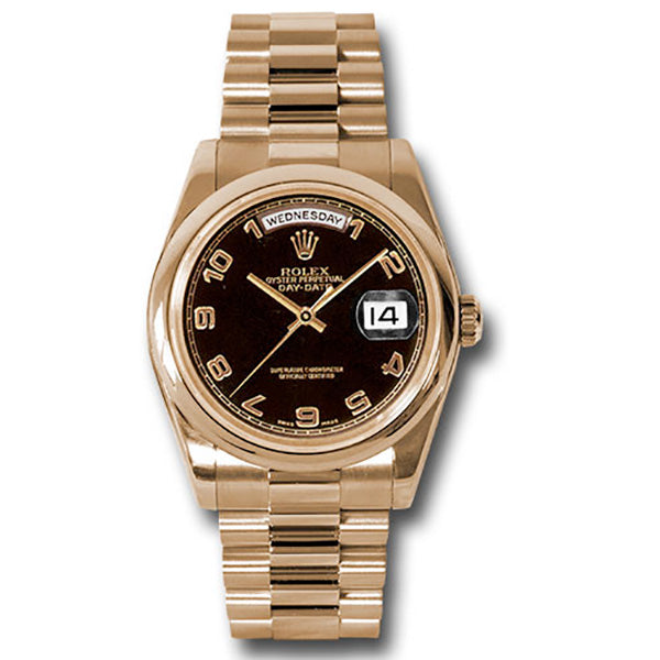 Rolex Day-Date Black Dial 18K Everose Gold President Automatic Mens Watch 118205BKAP. 18kt everose gold case with a 18kt everose gold Rolex President bracelet. Fixed - domed 18k everose gold bezel. Black dial with rose-gold tone hands and Arabic numeral hour markers. Minute markers. Automatic movement. Scratch resistant sapphire crystal. Screw down crown. Solid case back. Case diameter: 36 mm. Round case shape. Concealed crown clasp. Water resistant at 100 meters / 330 feet. Functions: date, day, hour, minute, second.