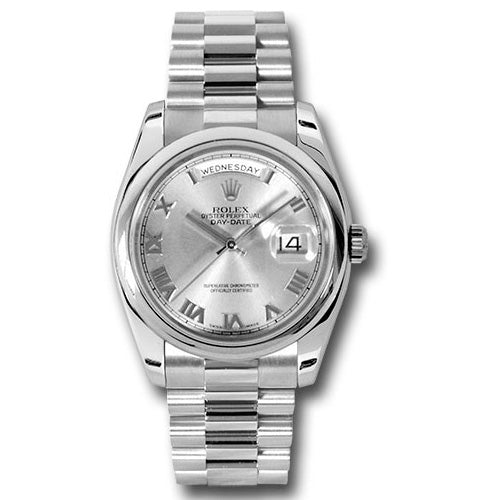 Rolex 118206 grp Oyster Perpetual Day-Date Watch. The Rolex President. 36mm platinum case, domed bezel, silver dial, Roman numerals, and President bracelet.
