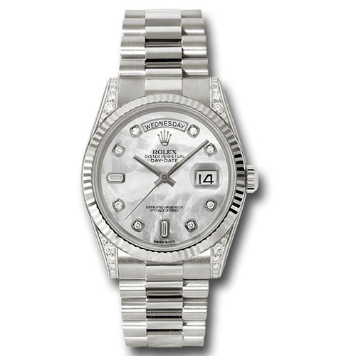 Rolex 118339 mdp Rolex Oyster Perpetual Day-Date Watch. 36mm 18K white gold case, case lugs set with 32 diamonds, fluted bezel, mother of pearl dial, diamond hour markers, and President bracelet.