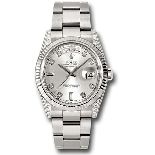 Rolex 118339SDO Oyster Perpetual Day-Date Men's Watch. 36mm 18kt white gold case, case lugs set with 32 diamonds, fluted bezel, silver dial, diamond hour markers, and Oyster bracelet.