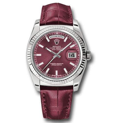Rolex 118139 chl Oyster Perpetual Day-Date Watch. 36mm 18K white gold case, fluted bezel, cherry dial, index hour markers, calibre 3155 self‑winding chronometer movement with day and date display, cherry leather strap with gold deployable clasp. Waterproof to 100 meters.