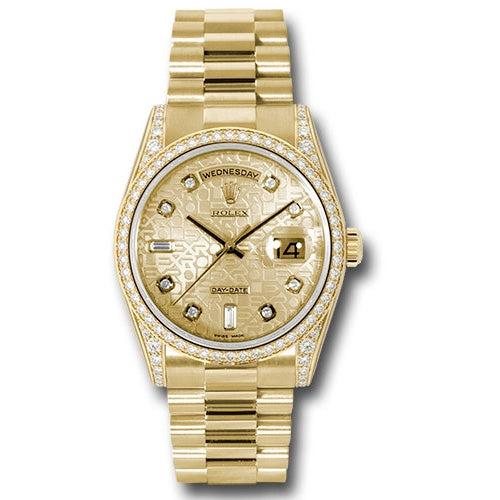 Rolex 118388 chjdp Oyster Perpetual Day-Date Watch. 36mm 18K yellow gold case, case lugs set with 32 diamonds, bezel set with 52 diamonds, champagne jubilee dial, diamond hour markers, and President bracelet.