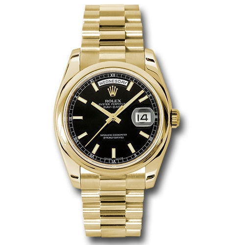 Rolex 118208 bksp Oyster Perpetual Day-Date Watch. 36mm 18K yellow gold case, domed bezel, black dial, index hour markers, and President bracelet.