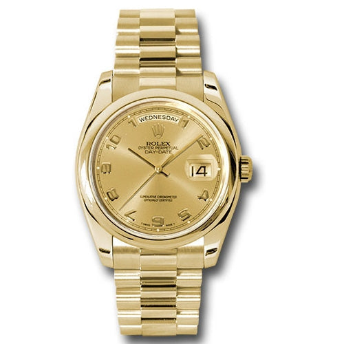 Rolex 118208 chap Oyster Perpetual Day-Date Watch. 36mm 18K yellow gold case, domed bezel, champagne dial, Arabic numerals, and President bracelet.