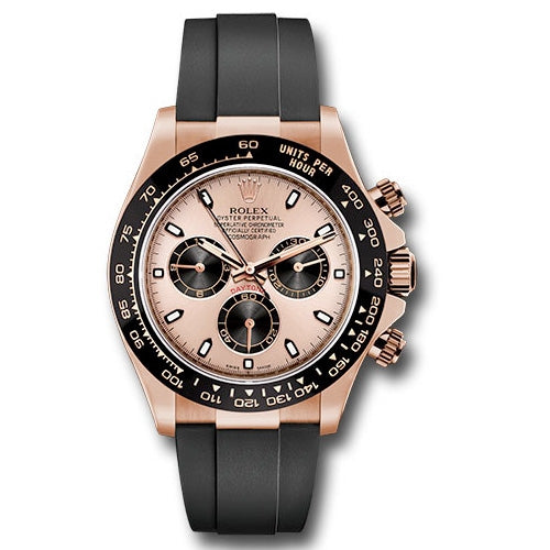 Rolex 116515LN pbkof Cosmograph Daytona Watch. 40mm 18K Everose gold case, screw-down Everose back, screw-down crown and push buttons with Triplock triple waterproofness, black monobloc Cerachrom bezel with engraved tachymetric scale, scratch-resistant double anti-reflective sapphire crystal, pink dial, black subdials, index hour markers, Rolex calibre 4130 perpetual self-winding movement with chronograph central second hand, 30-minute counter at 3 o'clock, and 12-hour counter at 9 o'clock, approximately 72 hours of power reserve, black Oysterflex strap made from flexible metal blades overmoulded with high-performance elastomer, Oysterlock folding safety buckle with Easylink 5mm rapid extension system. Waterproof to 100 meters.