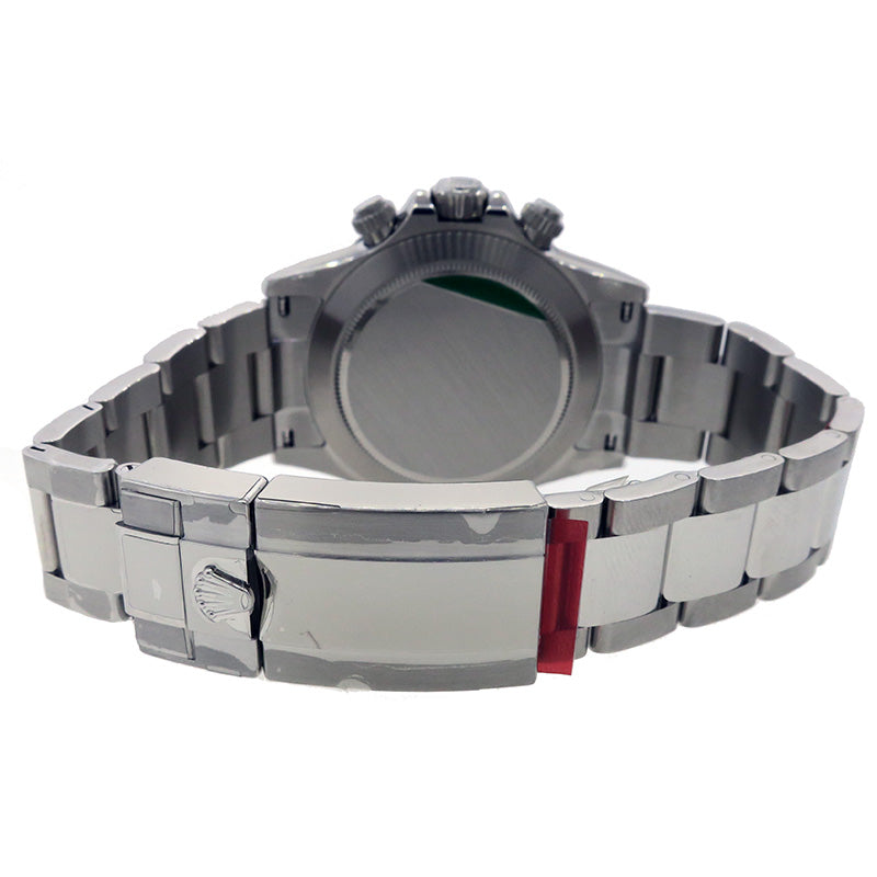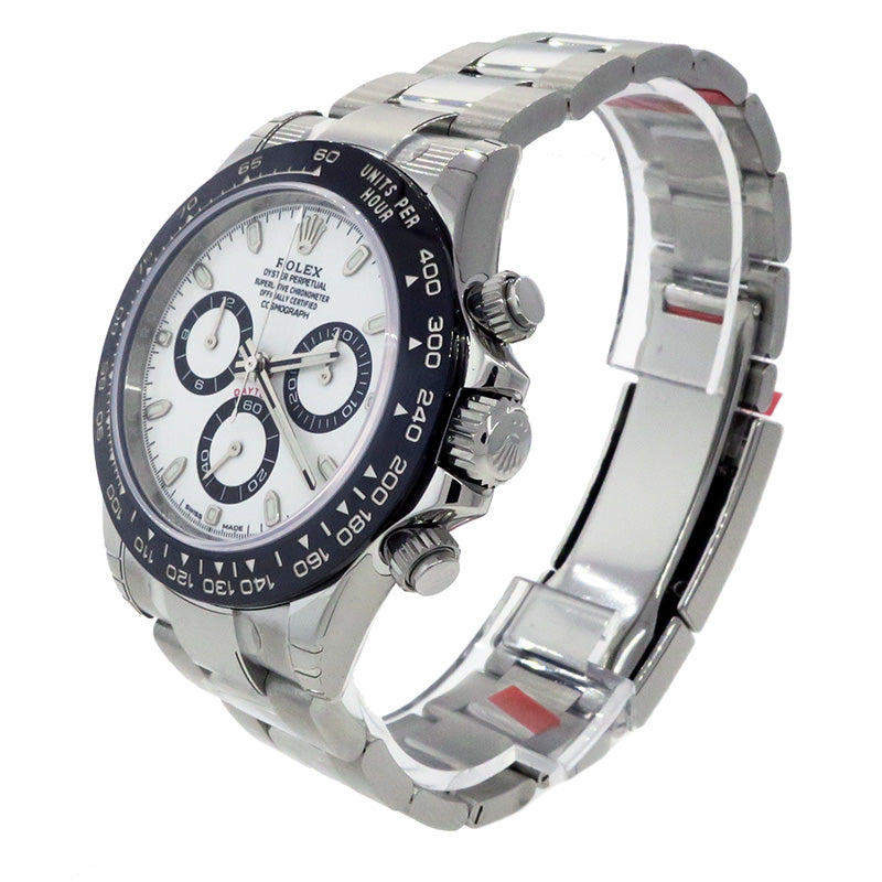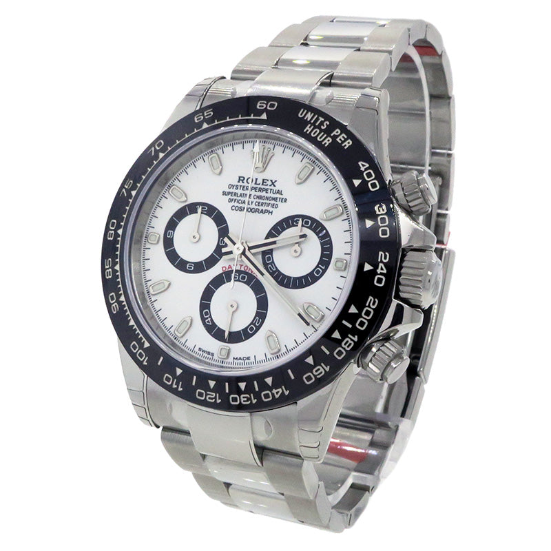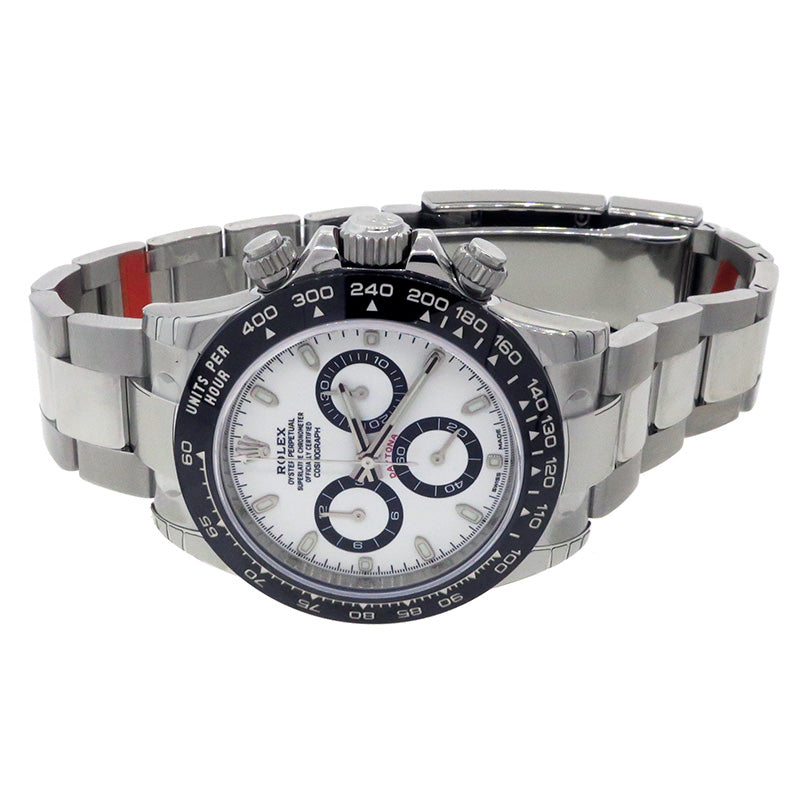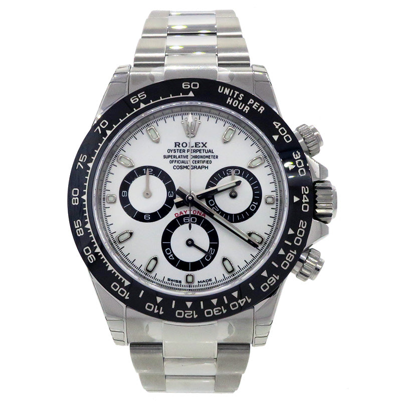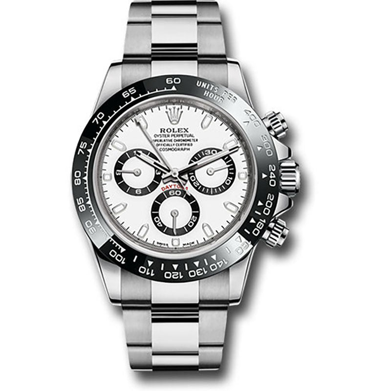 Rolex 116500LN w Oyster Perpetual Cosmograph Daytona Mens Watch. 40mm polished 904L stainless steel case, screw-down back and push buttons, screw-down crown and push buttons with Triplock triple waterproofness, black monobloc ceramic Cerachrom bezel with engraved tachymetric scale, scratch-resistant sapphire crystal, white "panda" lacquer dial, 18K white gold applied applique hour markers with Chromalight, black snailed counters, automatic movement with chronograph central second hand, 30-minute counter at 3 o'clock, and 12-hour counter at 9 o'clock, approximately 72 hours of power reserve, 904L stainless steel Oyster bracelet with solid links, folding Oysterlock buckle with Easylink 5mm comfort extension link. Waterproof to 100 meters.