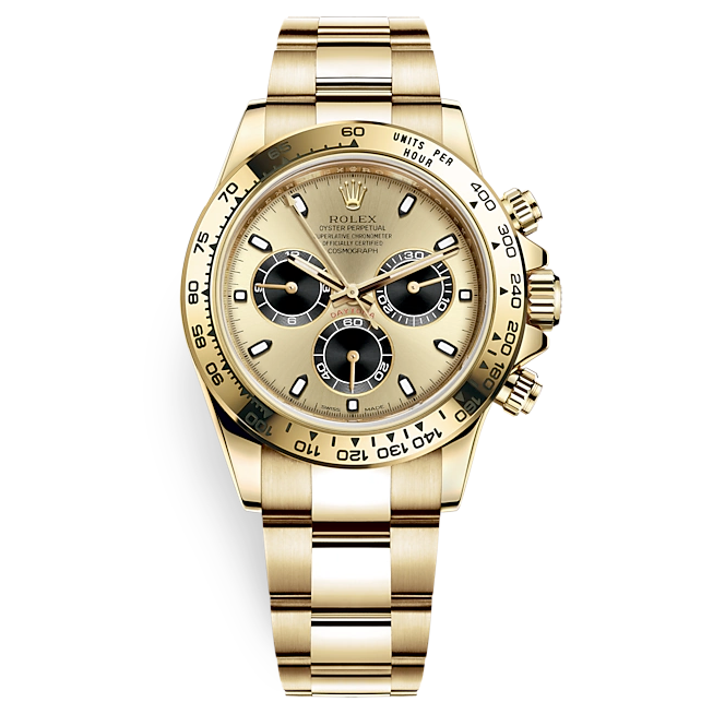 Rolex 116508 chbki Oyster Perpetual Cosmograph Daytona Watch. 40mm 18kt yellow gold case, screw-down back, screw-down crown and push buttons with Triplock triple waterproofness, fixed 18K yellow gold bezel with engraved tachymetric scale, scratch-resistant sapphire crystal, champagne dial, black subdials, index hour markers, Rolex calibre 4130 self-winding movement with chronograph central second hand, 30-minute counter at 3 o'clock, and 12-hour counter at 9 o'clock, approximately 72 hours of power reserve, 18kt yellow gold Oyster bracelet with flat three-piece links, folding Oysterlock buckle with Easylink 5mm comfort extension link. Waterproof to 100 meters.