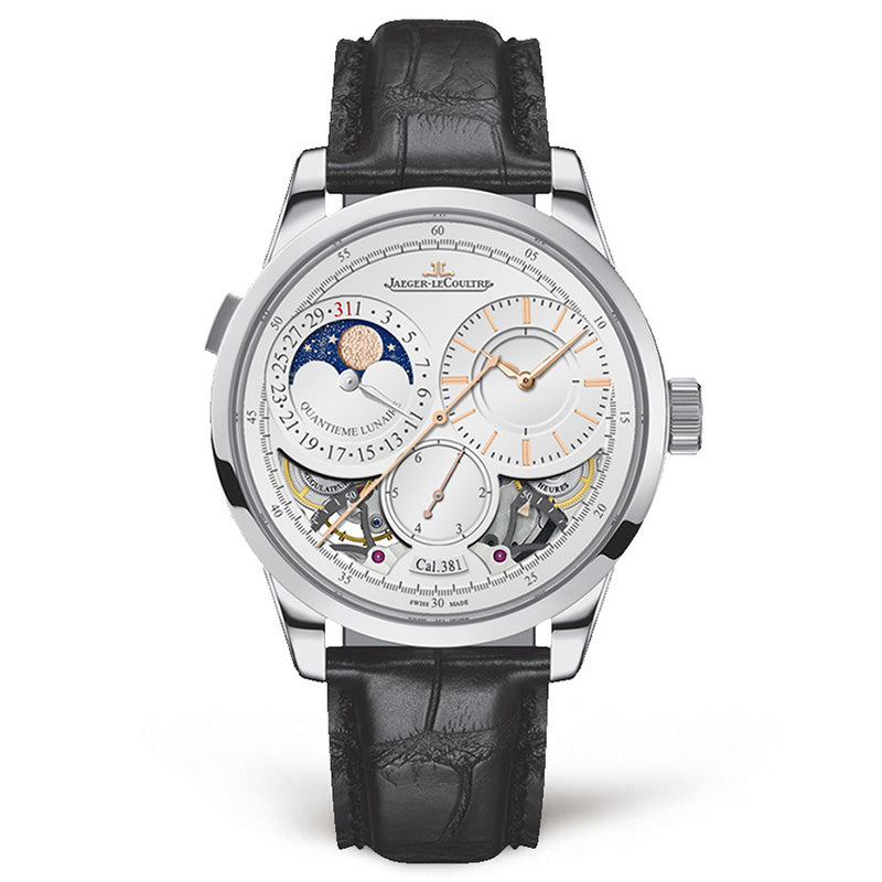Jaeger LeCoultre Duometre Quantieme Lunaire Mens Watch Q6043420. 18kt white gold case with a black leather strap. Fixed 18kt white gold bezel. Silver opaline cut-out dial with rose gold-tone hands and index hour markers. Minute markers around the outer rim. Jaeger LeCoultre Calibre JLC 381 hand wind movement with about 50 hours of power reserve. Scratch resistant sapphire crystal. Transparent case back. Case size: 40.5 mm. Case thickness: 13.5 mm. Round case shape. Water resistant at 50 meters / 165 feet. Functions: moon phase, date, hour, minute, second, power reserve indicator, jumping seconds. LIMITED EDITION OF ONLY 200 PIECES!