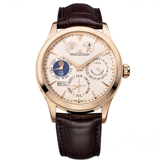 Jaeger LeCoultre Master Control Beige Dial 18K Pink Gold Mens Watch Q1612520. 18k rose gold case with a black alligator leather strap. Fixed bezel. Beige dial with pink gold-tone hands and index hour markers. Minute markers around the outer rim. Hand Wind movement. Caliber 876-440b engine with about 192 hours / 8 days power reserve. Scratch resistant sapphire crystal. Case diameter: 40 mm. Case thickness: 6.60 mm. Round case shape. Functions: hour, minute, second, perpetual calendar, moonphase.