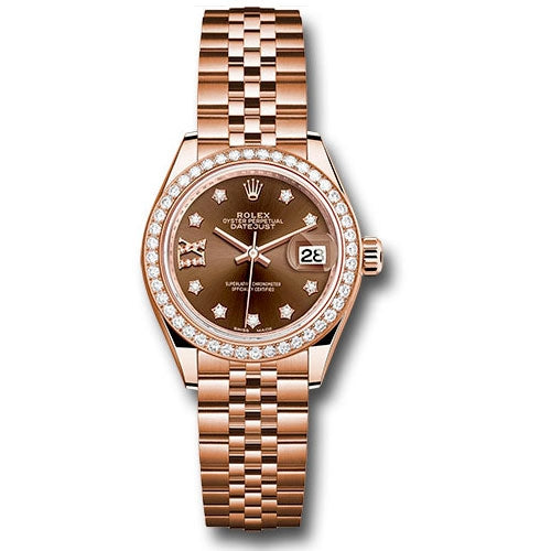 Rolex 279135RBR cho9dix8dj Datejust Lady 28 Everose Gold Diamond Bezel Jubilee Bracelet. 28mm 18K Everose gold oyster case, screw-down crown with twinlock double waterproofness system, bezel set with 44 diamonds, scratch-resistant sapphire crystal with cyclops lens over the date and double anti-reflective coating, chocolate dial, 9 diamonds set in star shaped hour marker settings and 8 diamond set in Roman numeral IX, Rolex calibre 2236 automatic movement with center hour, minute and seconds hands, instantaneous date with rapid setting, and stop-seconds for precise time setting, 18K Everose gold Jubilee bracelet with five-piece links, concealed folding Crownclasp buckle. Waterproof to 100 meters.