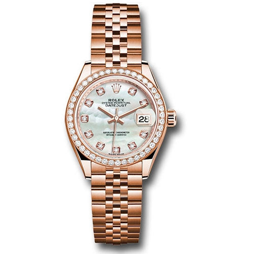 Rolex 279135RBR mdj Datejust Lady 28 Everose Gold Diamond Bezel Jubilee Bracelet. 28mm 18K Everose gold oyster case, screw-down crown with twinlock double waterproofness system, bezel set with 44 diamonds, scratch-resistant sapphire crystal with cyclops lens over the date, mother-of-pearl dial, 10 diamond hour markers, Rolex calibre 2236 automatic movement with center hour, minute and seconds hands, instantaneous date with rapid setting, and stop-seconds for precise time setting, approximately 55 hours of power reserve, 18K Everose gold Jubilee bracelet with five-piece links, concealed folding Crownclasp buckle. Waterproof to 100 meters.